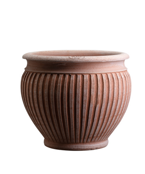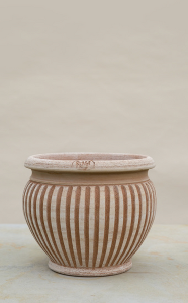 Brought to life on the pottery wheel, with beautifully ornate vertical lines carved into the body by a steady hand. A true masterpiece that upholds centuries of traditional artisanship. Recreate a timeless look within your home or outdoors with this amazing pot.