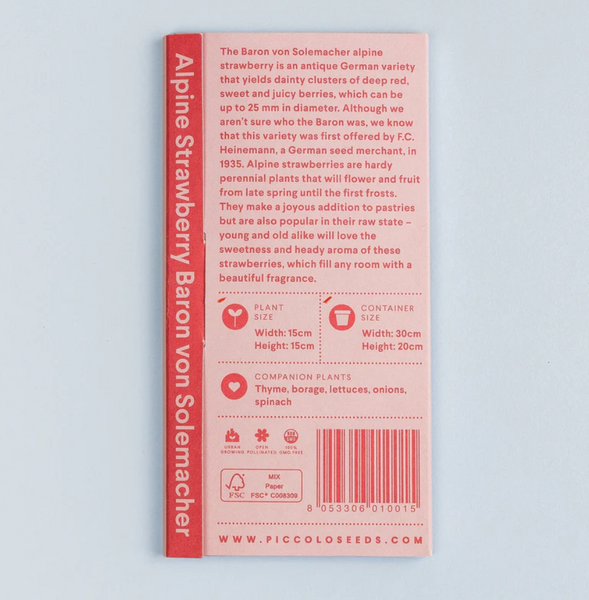 Although we aren’t sure who the Baron was, we know that this variety was first offered by F.C. Heinemann, a German seed merchant, in 1935. Alpine strawberries are hardy perennial plants that will flower and fruit from late spring until the first frosts. It’s also an early-fruiting variety – the first strawberries may develop as quickly as 3 months after sowing.